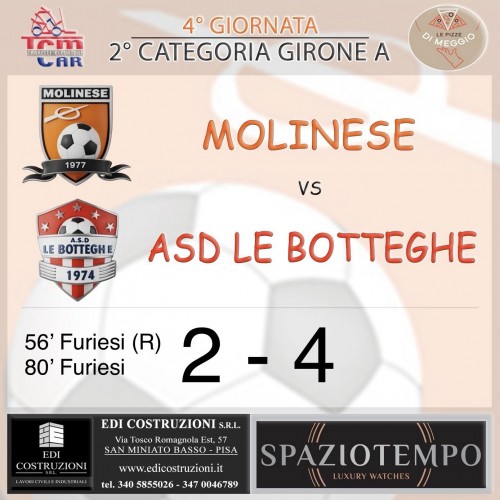 Partita giocata viso aperto senza troppi tatticismi da ambedue le squadre con continui rovesciamenti di fronte e qualche ghiotta occasione sfumata al momento di chiudere in porta. Il Malmantile va vicino alla segnatura con due legni scheggiati con tiri dalla distanza, mentre la Molinese sfiora la segnatura prima con Poggianti che conclude di poco alto dall'altezza del rigore a porta sguarnita e sul finire del tempo con Fico che si vede respingere il tiro dal difensore sulla riga di porta. Nel 2°t. La Molinese, almeno inizialmente, da la sensazione di crescere d'intensità e continuità d'azione arrivando spesso anche in area di rigore avversaria ma senza mai trovare quella giocata finale per calciare pericolosamente a rete. A metà ripresa la Molinese trova il vantaggio. Recupero palla a centrocampo, verticalizzazione ad innescare Fico che punta l'aria di rigore, sembra avere la meglio sull'avversario, che però lo trattiene per la maglia. Arbitro ben appostato vede la maglia allungarsi e indica subito il calcio di rigore. Sul dischetto si presenta Furiesi che spiazza il portiere con un rasoterra incrociando col Destro. Il vantaggio raggiunto sembra un po' accontentare la squadra che arretra qualche metro il baricentro e sta più in controllo. Questo porta a maggior mischia davanti l'area di rigore, qualche palla in più buttata in area di rigore e proprio da un innocuo traversone in area di rigore, l'arbitro s'inventa un gioco pericoloso per una gamba troppo alta che respinge la palla, concedendo una punizione di seconda. Praticamente tutti in barriera. Il tiro e' forte e sicuramente nello specchio della porta, ma Mosconi si oppone col corpo facendo impennare la palla mandandola in calcio d'angolo. Dal corner il Malmantile trova il pari con una deviazione in mischia sotto-porta. Nel poco tempo restante prevale stanchezza e prudenza. Unica occasione vera la produce Rossi con un bel guizzo in area di rigore che sembra liberarsi per il tiro, ma un po' viene trattenuto per la maglia e un po' perde l'equilibrio al momento di finalizzare. Giusta la divisione della posta, ma anche un po' di rammarico per essersi fatti sfuggire l'occasione di fare bottino pieno !